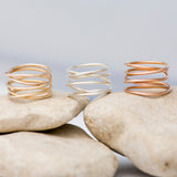 The Goods: This ring is made from a continuous band of 14k gold-fill or sterling silver. It wraps around the finger 5 times and has no beginning or end. It is an elegant and simple piece that adds to any ring collection.