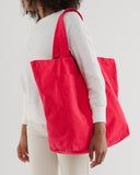 An oversized tote for easy carrying, with two large exterior patch pockets. Two interior patch pockets, sized to fit an iPhone Plus. Two sets of straps, for in hand carrying or over shoulder toting.